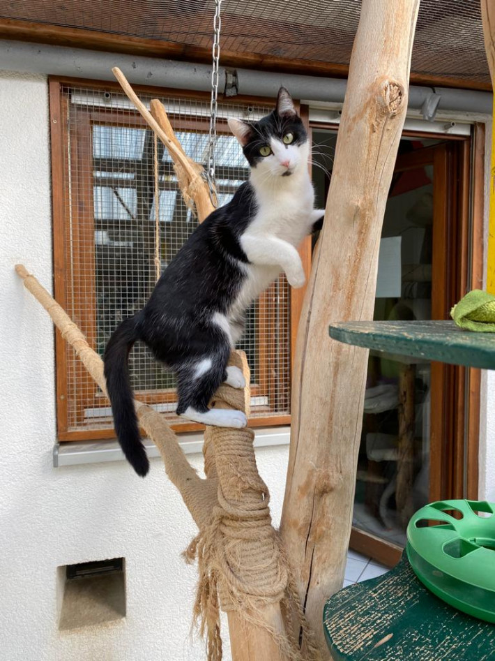 Kommt man Felina zu nah oder enttarnt sie in ihrem Kratzbaum reagiert sie mit einer starken Abwehrhaltung und dann wird ordentlich gefaucht und gespuckt. Felina hatte vermutlich noch nie wirklich Menschenkontakt kennengerlernt, daher sind Menschen für sie etwas ängstliches und unberechenbares. Bei einer ängstlichen und schüchternen Katze ist Geduld der Weg zum Ziel.