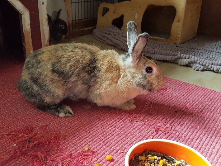 Lucie kam zu uns, da sie sich mit dem vorhandenen Kaninchen leider nicht vertragen hat. Bei uns lebt sie in einer Gruppe von mehreren Kaninchen und das klappt super. Sie mögen sich alle, putzen sich gegenseitig und pflegen ihre sozialen Bedürfnisse. Lucie sucht ein neues Zuhause mit Artgenossen und viel Platz zum toben und Haken schlagen.